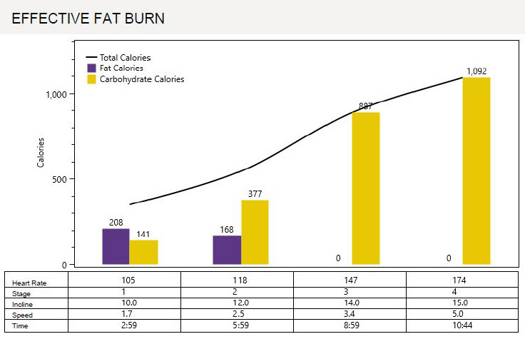 The test also determines the number of calories burned during every level of exercise, providing valuable information when designing a weight loss program. And if CO2 is measured during the test, a Respiratory Exchange Ratio (RER) can determine the proportion of energy coming from carbohydrates and fats at various levels of exercise intensity. Since physical conditioning and exercise intensity affect these proportions, this information can be very helpful when designing a workout intended to burn fat.
